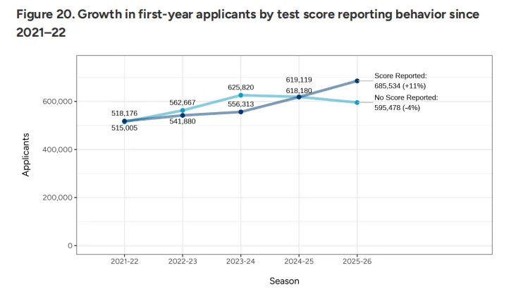 报告数据显示,提交SAT/ACT等标化成绩的申请者达685,534人,同比激增11%,而未提交者人数则下降了4%