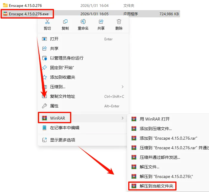 2.打开刚刚解压的文件夹,选中“Enscape-4.15.0.276.exe”文件,鼠标右键选择“以管理员身份运行”