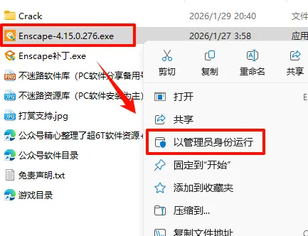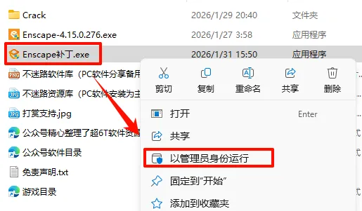 8.返回之前解压的“Enscape-4.15.0.276”文件夹,选中“Enscape补丁.exe”文件,鼠标右键选择“以管理员身份运行”