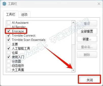 14.勾选“Enscape”选项就会出现Enscape工具栏,点击“关闭”