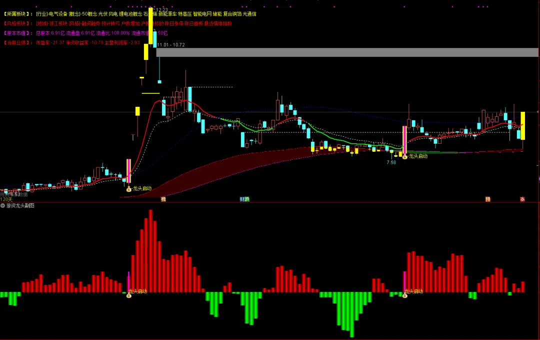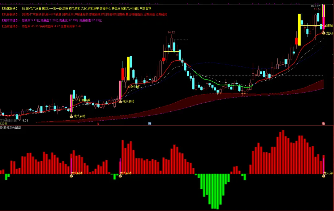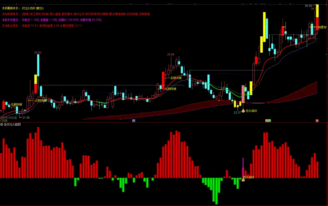 DRAWTEXT(主升浪,0.69,’龙头启动’),COLORYELLOW;
