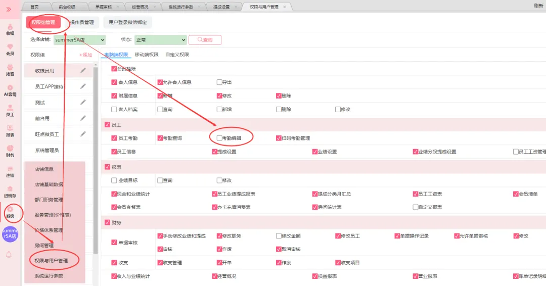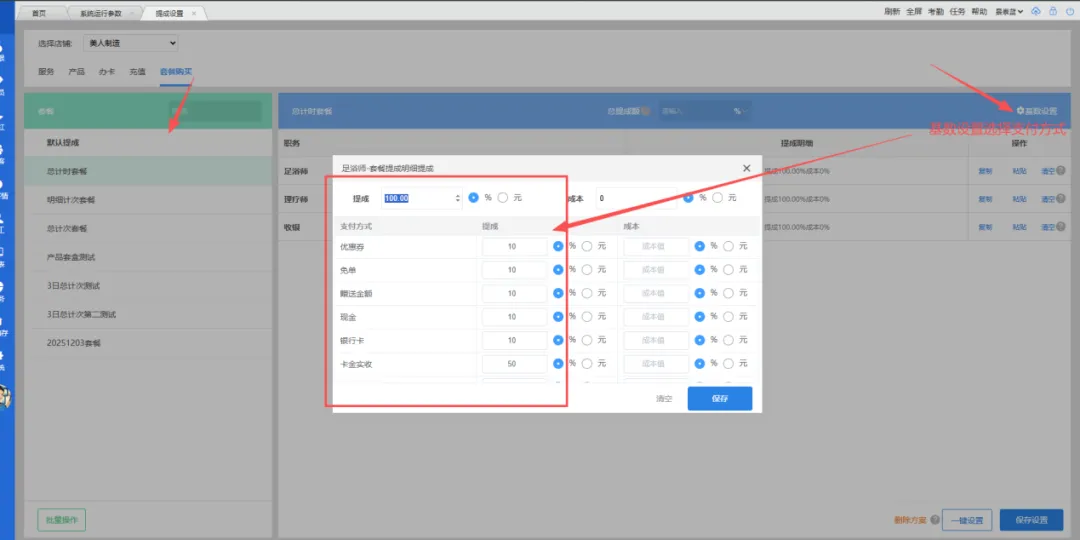 2)开启基本参数57业绩提成设置区分不同支付方式,勾选套餐购买