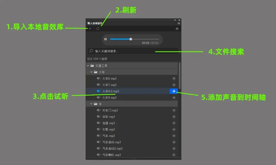 如图所示,我们把本地私藏的音效库导入插件面板里,然后只需要三步,轻松拿捏音效添加!