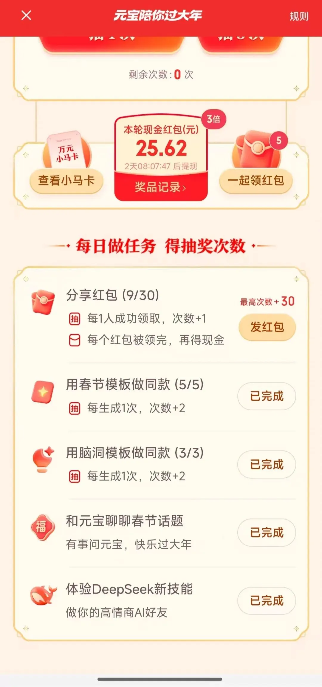 元宝App的10亿红包活动,今天开始,通过抽奖,可以获得现金红包、红包膨胀卡、万元小马卡、分享红包、惊喜权益、新春祝福。每日做任务,可以获得抽奖次数。通过复制别人的口令,也能获得红包。10个分享的红包被领取后,还能额外解锁现金福利。每人有5个红包可分享,50个红包可以被领取。