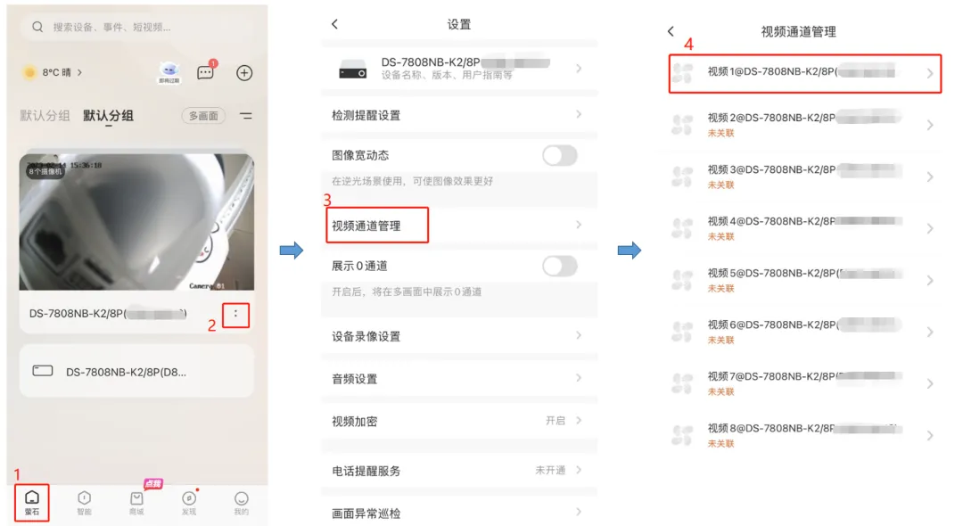 1、登入萤石云APP,点击型号旁边“..”,点击视频通道管理,选择对应要隐藏/关闭隐藏的通道