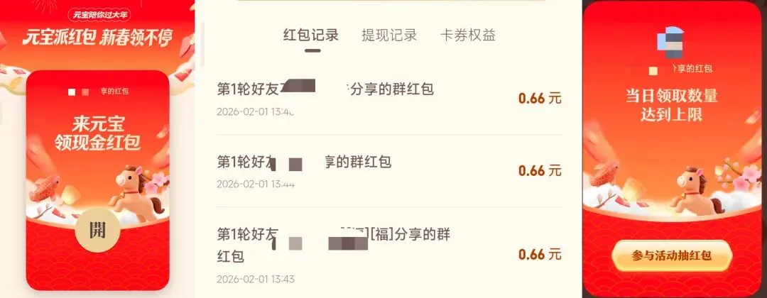 所以,反过来咱也可以去点开好友的红包链接(不要点击陌生链接,谨防诈骗,所有操作仅在元宝官方App内完成的),就会得到一个红包,一般的话是0.66元一个。