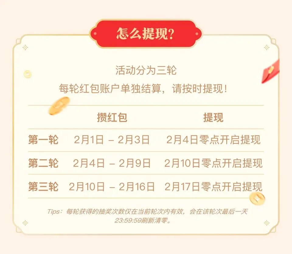 第一轮活动时间是2月1日-2月3日,提现时间是到2月4日零点开启,绑定微信即可领取。