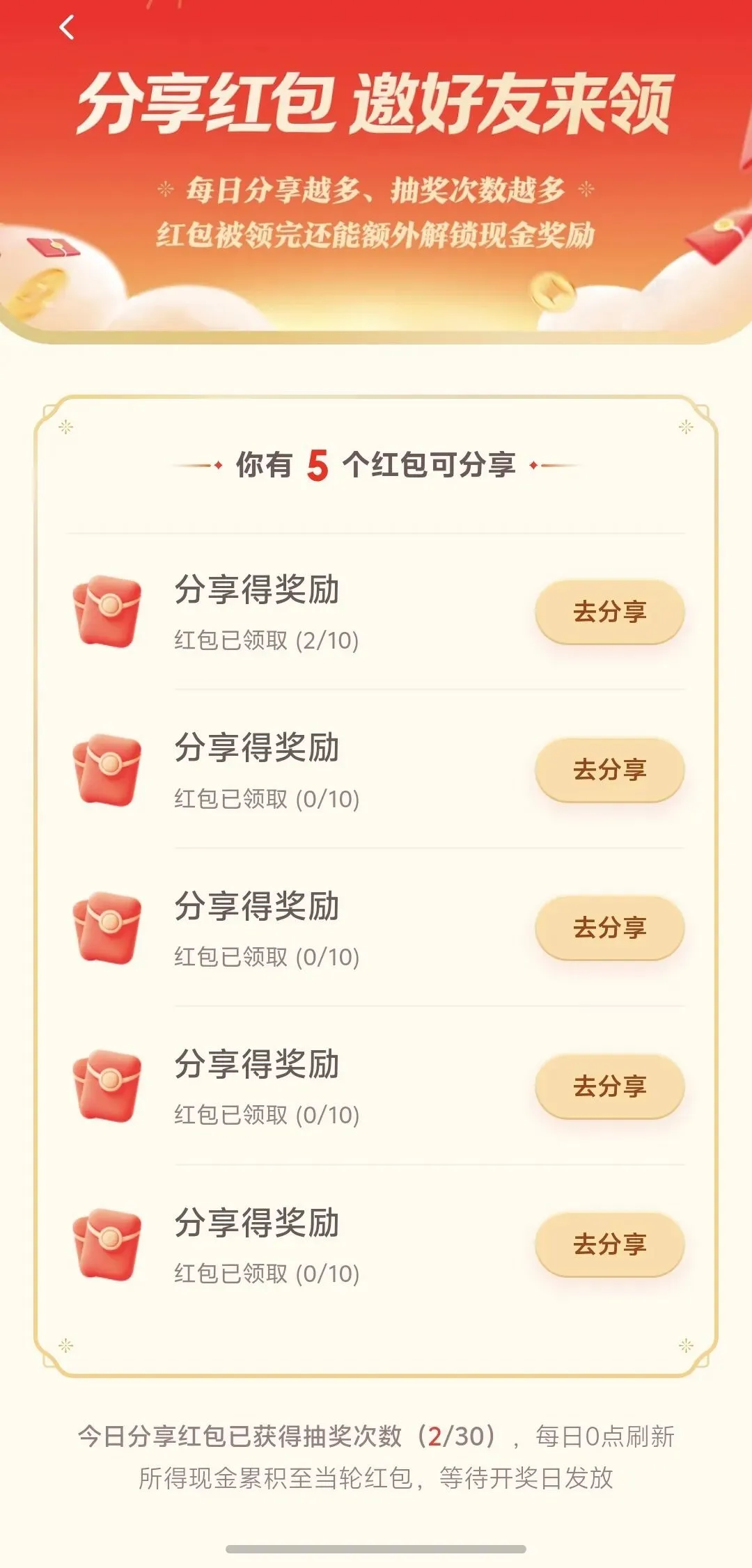每日做任务即可得抽奖次数,别人领取你的抽奖红包你也可以获取抽奖次数(最高30次),具体规则如下: