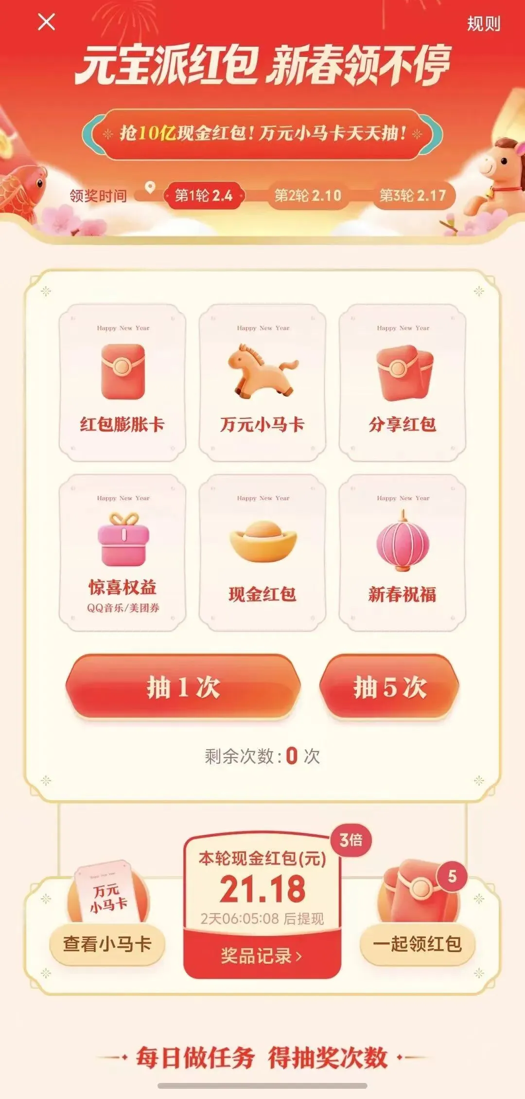 3. 提现规则:第一轮活动时间为2月1日至2月3日,2月4日零点开启提现通道,绑定微信就能直接领取红包;