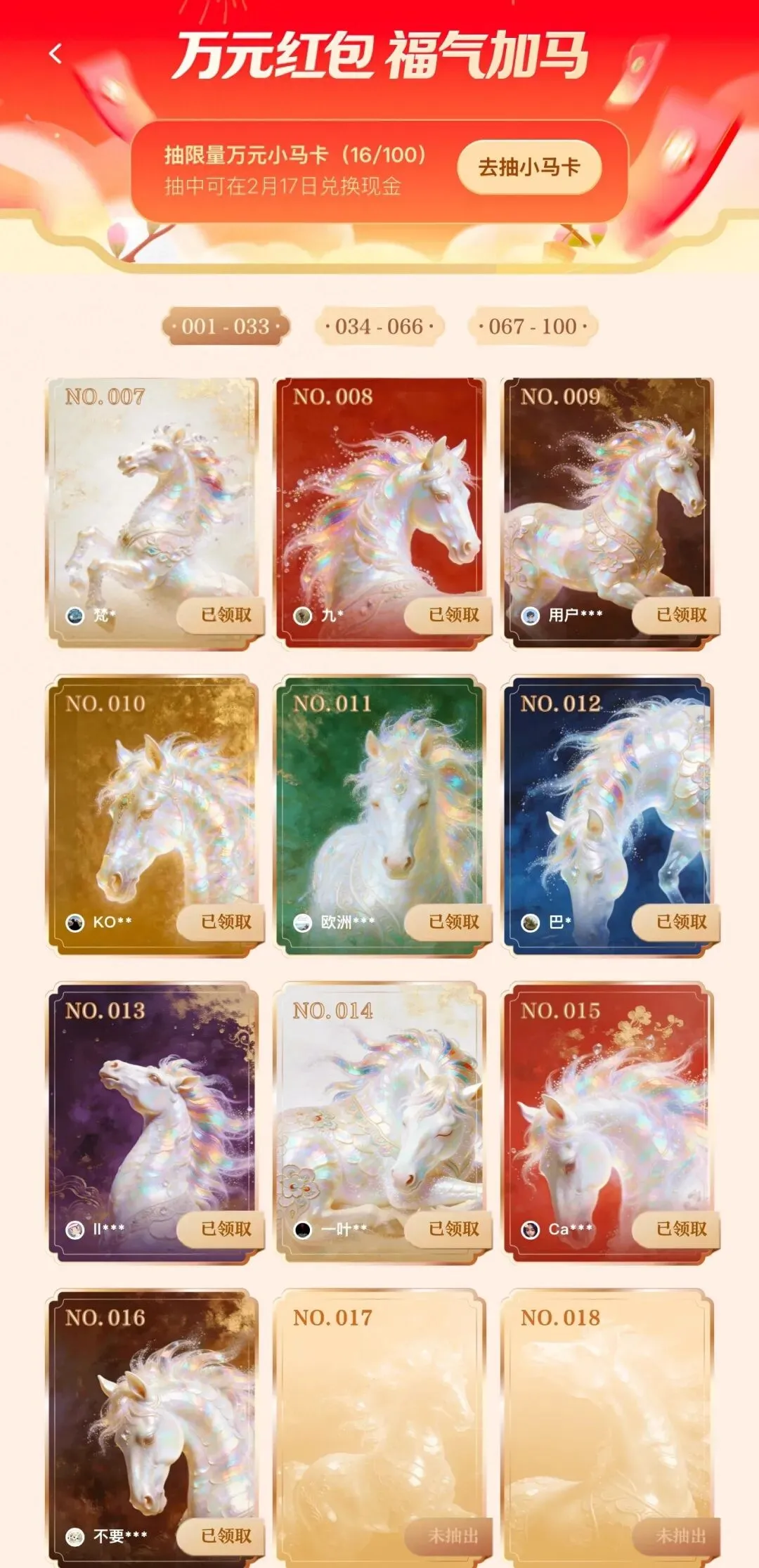 在主会场,用户每天都可获得5次抽奖机会,通过做任务,每天还可以额外获得40+次抽奖机会,有机会抽到现金红包、万元现金小马卡、红包膨胀卡、分享红包、惊喜权益、新春祝福等不同类型红包。