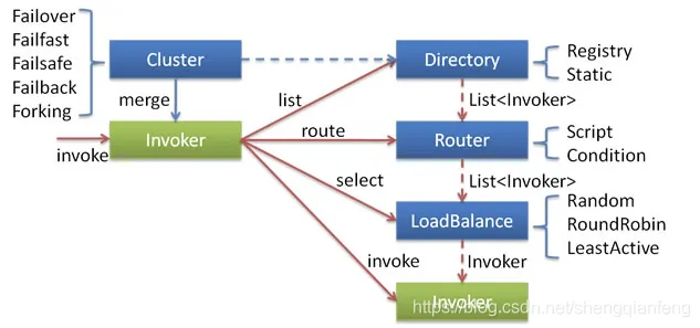 服务列表有了,负载均衡器也有了,接下来就是集群调用了,集群的调用方式如图所示,默认的就是FailOver这种失败自动切换方式了。