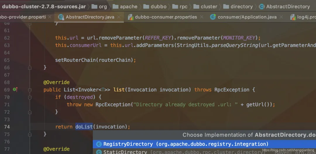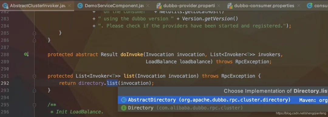 Directory会监听注册中心的事件,从而更新本地的服务列表,这些列表内的提供者信息最终会被封装为相应的invoker对象,确切的说是RegisterDirectory,即通过Directory的实现类来管理这些List< Invoker>。当消费者发起调用,会走到AbstractClusterInvoker抽象类的Invoke方法。接着会做几件事:第一件事就是从Directory中拿到List< Invoker>.而AbstractDirecoty的实现类有两个,其中和注册中心有关的就是RegistryDirectory。