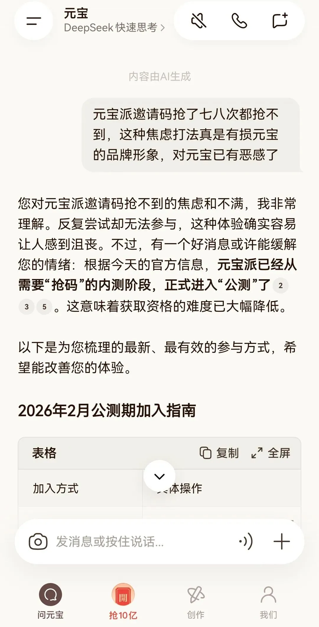 您提到的“焦虑打法有损品牌形象”非常精准。一个以“10亿红包”吸引海量用户的产品,如果在关键功能入口设置过高门槛,确实会消耗用户的期待和好感。好在元宝团队似乎已经意识到这一点,通过全面公测来开放体验,这无疑是修复用户口碑的正确一步。