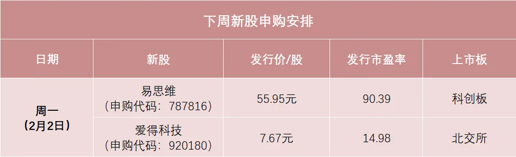 汽车机器视觉龙头,来了!根据目前的发行安排,下周有2只新股申购,均在周一(2月2日),分别是科创板新股易思维、北交所新股爱得科技。其中,易思维是国内汽车制造机器视觉设备龙头,易思维专注于汽车制造机器视觉设备的研发、生产及销售,为汽车整车及零部件制造过程的各工艺环节提供机器视觉解决方案,是该领域国内市占率第一的国家重点“小巨人”企业。(中证报)