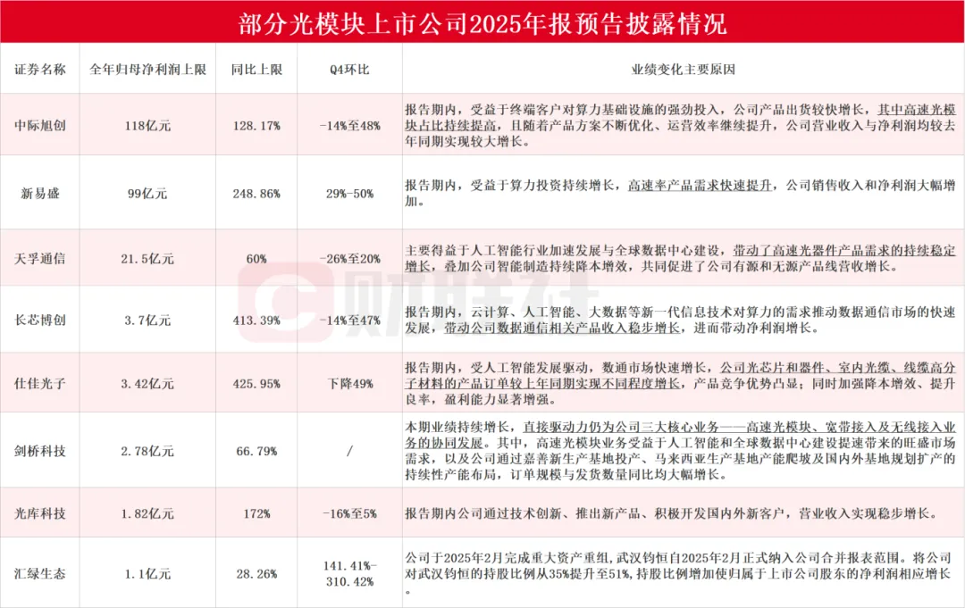 据财联社不完全统计,截至发稿,包括中际旭创、新易盛、天孚通信、长芯博创、仕佳光子、剑桥科技、光库科技和汇绿生态在内的多家光模块上市公司披露2025年度业绩预告。其中,中际旭创2025年净利同比预增89.50%-128.17%;新易盛Q4净利预计环比增长29%-50%。(财联社)