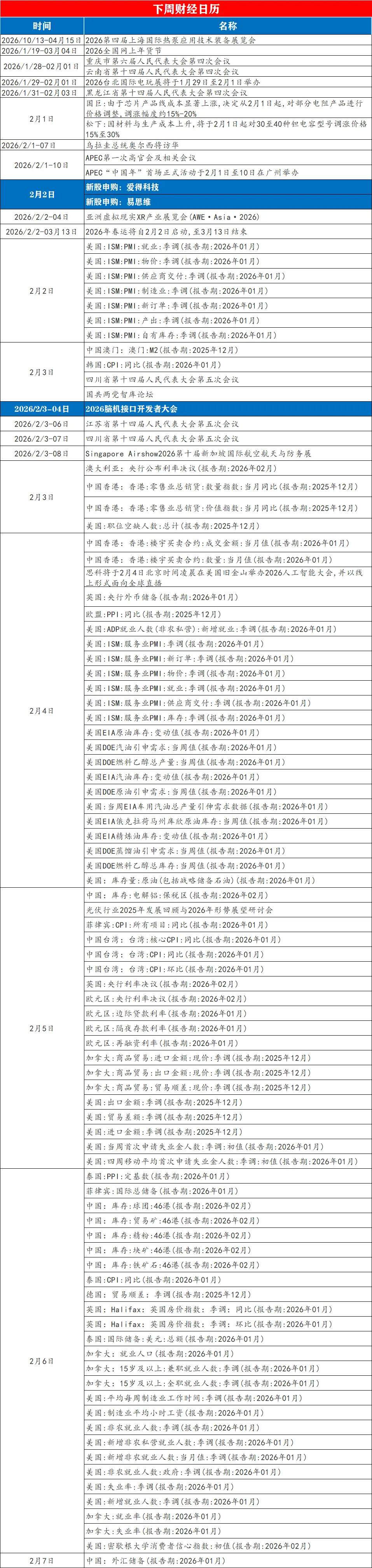 周末:春节AI大战开打!元宝登顶App Store免费榜!10亿红包驱动“社交裂变” 全民红包雨或引爆AI应用;SpaceX申请部署100万颗卫星 打造太空数据中心;金价大跳水后 有人斥资20多万元抄底买入 称“不在意短期涨跌” 多家银行已发布风险提示;国投白银LOF:本基金将于2月2日开市起至当日10:30停牌;全球芯片产业链传来利好信号:韩国1月半导体出口暴增超102%、国内涨价潮愈演愈烈;锋龙股份、嘉美包装两大牛股公告:停牌核查完成 股票复牌;高盛:不要”过度解读”过去两天的暴跌 大逻辑没有变化 尤其要考虑1月的大涨;申万宏源:市场仍预期2026年美联储降息2次;汽车机器视觉龙头来了!下周2只新股申购;光模块三剑客2025年业绩预告出炉 新易盛Q4净利预计环比增长29%-50%;囤内存条的人赚到钱了吗?商家不敢压货、个人炒家被套住 “希望价格回归到平稳状态”特朗普提名前美联储理事凯文·沃什为下任美联储主席
