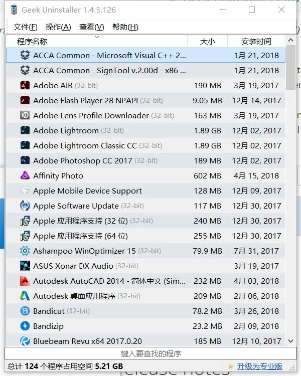 卸载软件,几乎是我每次换新工作地点首装的软件,没有之一。因为几乎每个上一手都会装乱七八糟的软件,然后卡得一B,不把那加装的360/金山全家桶,乱装的N个浏览器,和有广告弹框的视频播放软件删掉,我觉得我绝B过不了试用期这次就推荐Geek Uninstaller作为卸载软件,大小不足10MB,能把软件卸载干净无残留。至于为什么不用系统自带的卸载软件,那你试一下卸载个什么国产全家桶试下,残留的东西分分还在,开机卡死你。