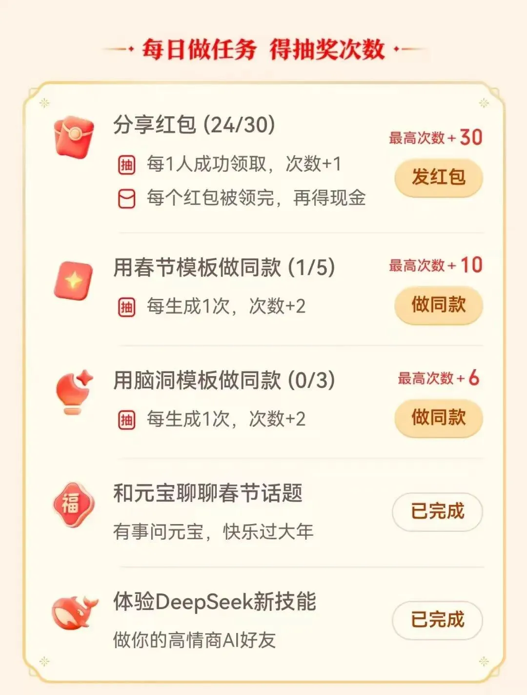 腾讯元宝通过此次活动,将AI、社交与春节场景深度融合,旨在重现2015年微信红包的全民参与盛况。除现金奖励外,App内还提供新春写真、创意壁纸等互动玩法,丰富用户体验。