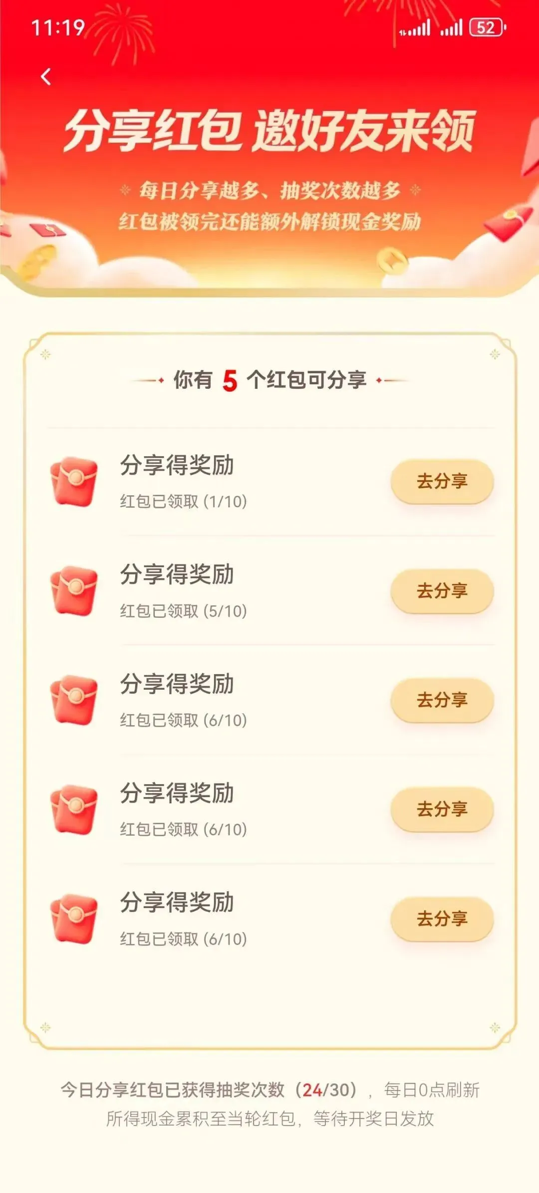 分享红包给好友,好友拆开后双方均可获得奖励,分享者还能额外获得抽奖次数与现金。