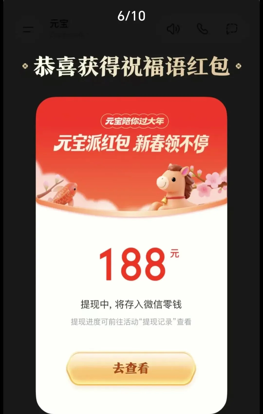 2. 在元宝App“问元宝”对话框中输入对应祝福语,即有机会触发红包,金额最高可达188元或888元。