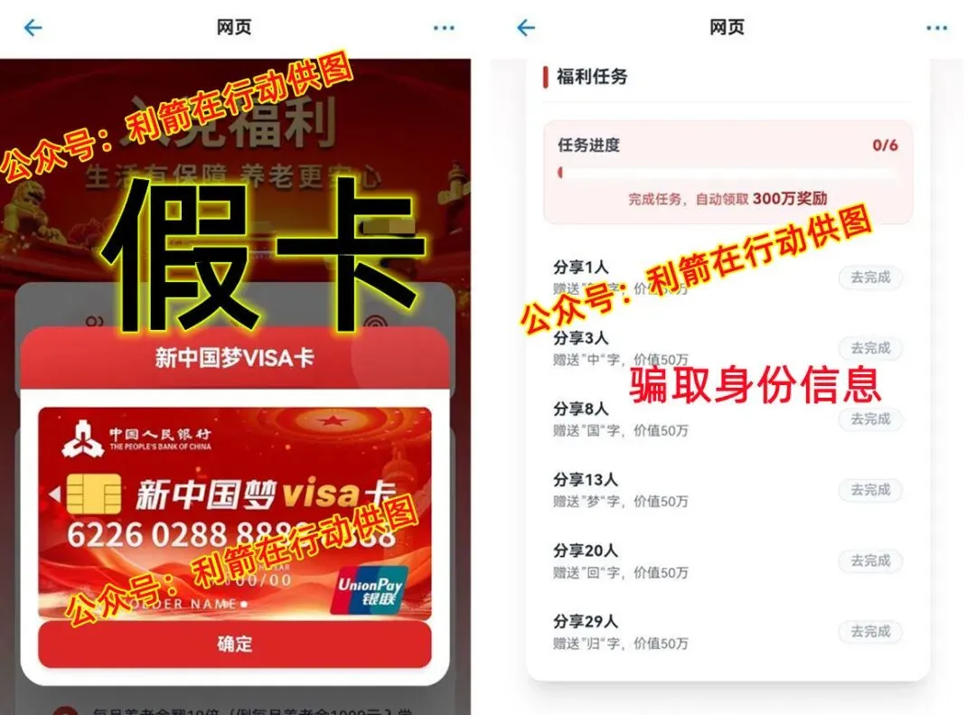 集齐“新中国梦回归”6个字,就能获得300万元奖励?“一字值万金”?这明显就是用一串串的数字骗取参与者的身份信息,在以后“新中国梦VISA卡”提现的时候,按照同类型骗局套路,这种虚假数字越多,被要求缴纳“激活费”、“个人所得税”、“账户管理费”、“统一提现费”、“U盾”费就越多,被骗的钱就越多,今天谁拉人注册越多,以后被骗的就最惨……….