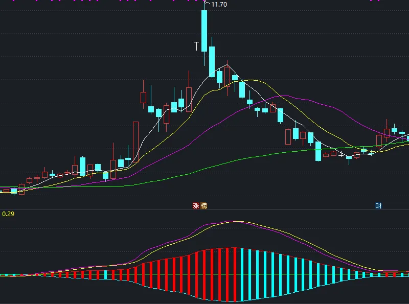当紫线下穿黄线,柱子变青色,则说明多头的力量在衰减,可能要进入一段震荡或整理。