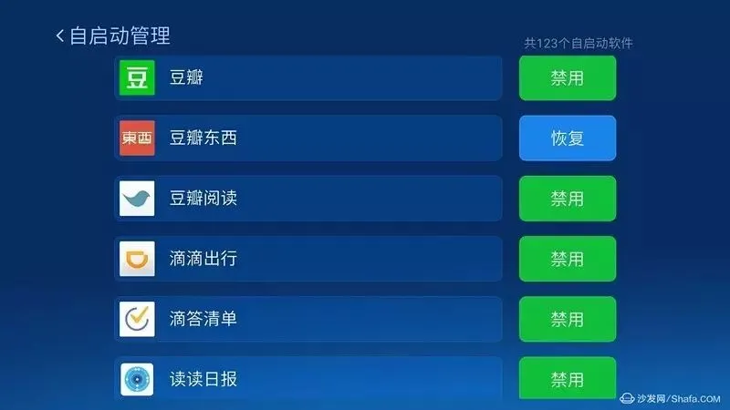 另外,沙发管家在智能电视上的一些工具箱,到了手机上同样可以使用。举个栗子,沙发管家同样可以管理自启动应用,禁用或者恢复都可以。