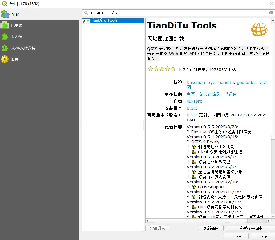 ■ QGIS中搜索插件“TianDiTu Tools”安装