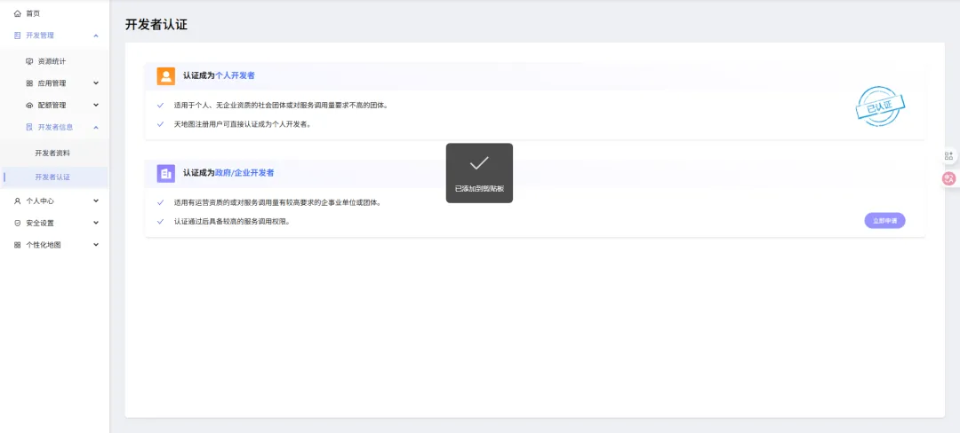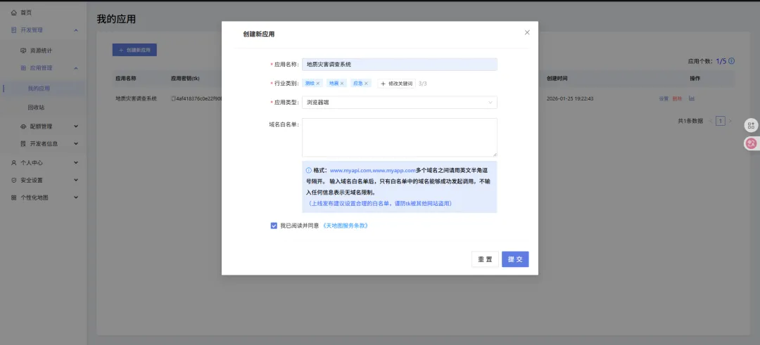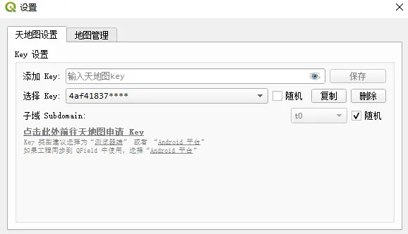 (5)复制应用密钥,在天地图设置中添加Key,点击保存即可