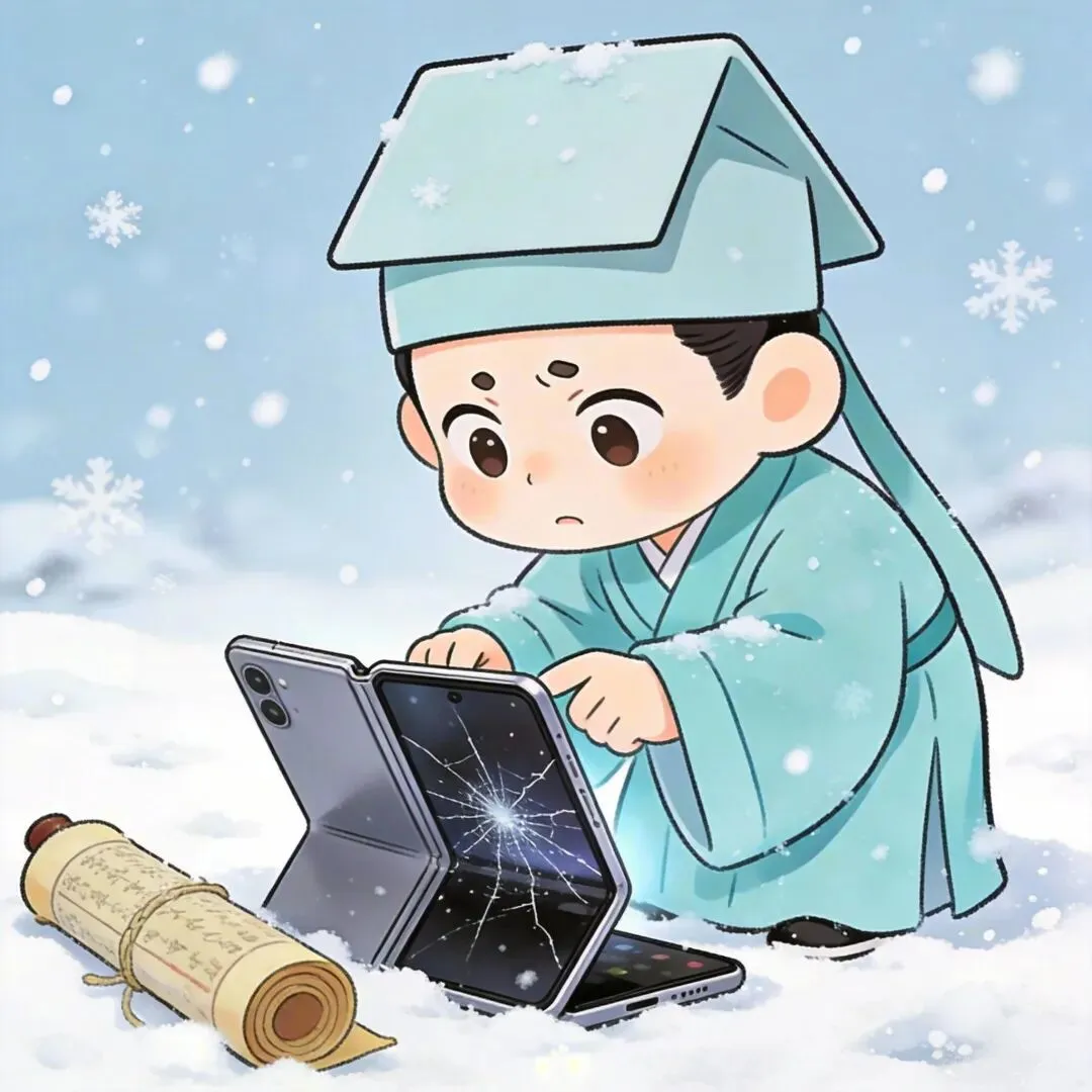 明哥研究冻裂的折叠屏:“这‘折纸术’竟怕寒冬?比咱们的绢本册页还娇气!零下就变‘碎碎冰’,古人卷轴千年不坏,现代科技还得加把劲啊。要不,裹个棉袄试试?”