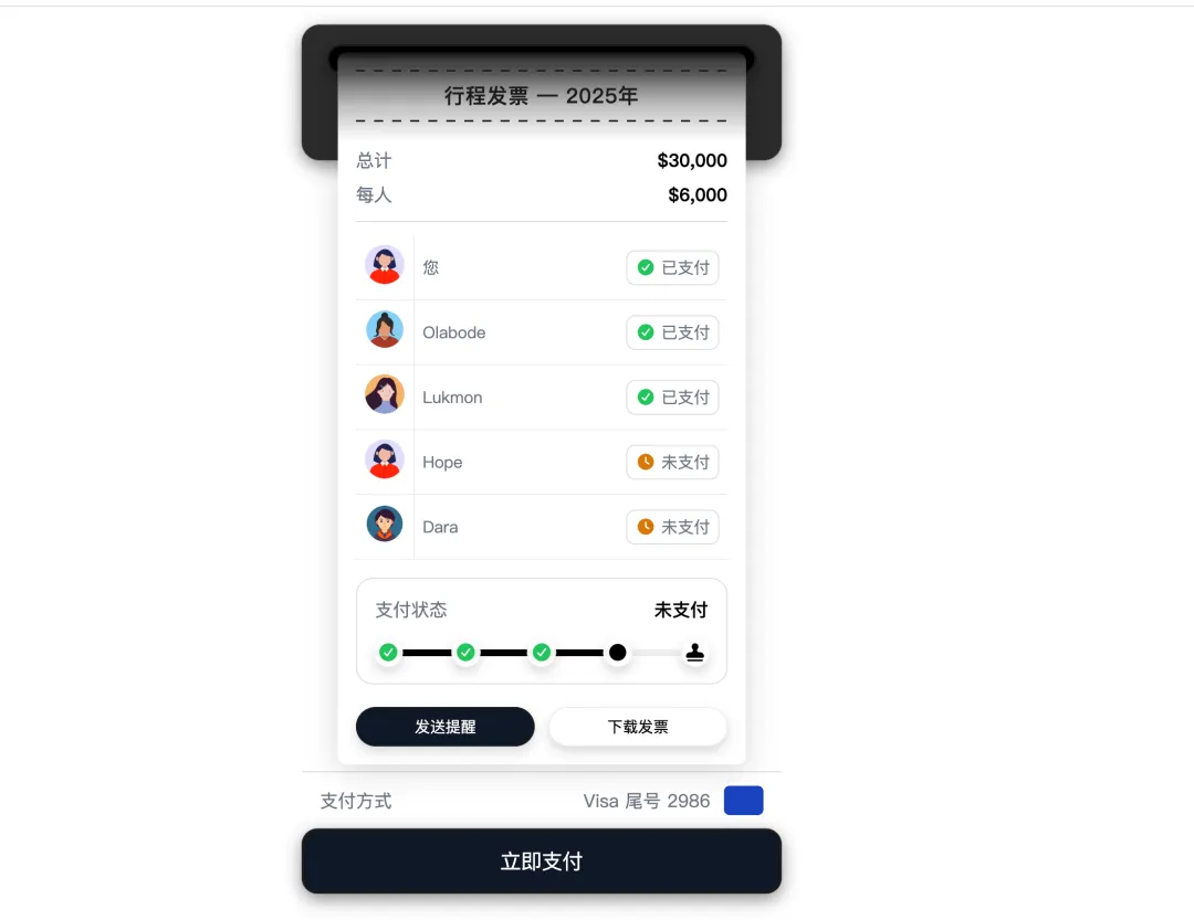 <!DOCTYPE html><htmllang="ru"><head><metacharset="UTF-8"><title>鹏魔王</title><linkrel="stylesheet"href="./style.css"></head><body><linkrel="stylesheet"href="https://cdnjs.cloudflare.com/ajax/libs/font-awesome/7.0.1/css/all.min.css"integrity="sha512-2SwdPD6INVrV/lHTZbO2nodKhrnDdJK9/kg2XD1r9uGqPo1cUbujc+IYdlYdEErWNu69gVcYgdxlmVmzTWnetw=="crossorigin="anonymous"referrerpolicy="no-referrer" /><sectionclass="container"><sectionclass="invoice-container"><divclass="invoice-slot"><divclass="slot-hole"></div></div><divclass="invoice"><h2class="title">Счет за поездку </h2><pclass="amount">Итого <spanclass="value">$30,000</span></p><pclass="amount">На человека <spanclass="value">$6,000</span></p><hr /><ulclass="payers-list"><li><divclass="payer-image-container"><imgsrc="https://res.cloudinary.com/dmuyehme1/image/upload/v1761081494/user1_okmfkd.png" /></div><p>Вы<spanclass="pay-tag"><iclass="fa-solid fa-circle-check"></i> Оплачено</span></p></li><li><divclass="payer-image-container"><imgsrc="https://res.cloudinary.com/dmuyehme1/image/upload/v1761082627/user4_dujvoe.svg" /></div><p>Olabode<spanclass="pay-tag"><iclass="fa-solid fa-circle-check"></i> Оплачено</span></p></li><li><divclass="payer-image-container"><imgsrc="https://res.cloudinary.com/dmuyehme1/image/upload/v1761082286/user3_ue0zzq.avif" /></div><p>Lukmon<spanclass="pay-tag"><iclass="fa-solid fa-circle-check"></i> Оплачено</span></p></li><li><divclass="payer-image-container"><imgsrc="https://res.cloudinary.com/dmuyehme1/image/upload/v1761081494/user1_okmfkd.png" /></div><p>Hope<spanclass="pay-tag"><iclass="fa-solid fa-clock"></i> Не оплачено</span></p></li><li><divclass="payer-image-container"><imgsrc="https://res.cloudinary.com/dmuyehme1/image/upload/v1761082184/user2_b821x7.avif" /></div><p>Dara<spanclass="pay-tag"><iclass="fa-solid fa-clock"></i> Не оплачено</span></p></li></ul><divclass="payment-status"><pclass="heading">Статус оплаты<span>Не оплачено</span></p><divclass="status-progress"><divclass="checkpoint"><iclass="fa-solid fa-circle-check"></i></div><divclass="checkpoint"><iclass="fa-solid fa-circle-check"></i></div><divclass="checkpoint"><iclass="fa-solid fa-circle-check"></i></div><divclass="checkpoint"><spanclass="circle"></span></div><divclass="checkpoint"><iclass="fa-solid fa-stamp"></i></div></div></div><divclass="btn-group"><buttonclass="btn reminder-btn">Отправить напоминание</button><buttonclass="btn download-btn">Скачать счет</button></div></div></section><hr /><divclass="payment-info"><p>Способ оплаты</p><divclass="card-info"><p>Visa, заканчивающаяся на 2986</p><spanclass="card-icon"></span></div></div><buttonclass="pay-now-btn">Оплатить сейчас</button></section></body></html>