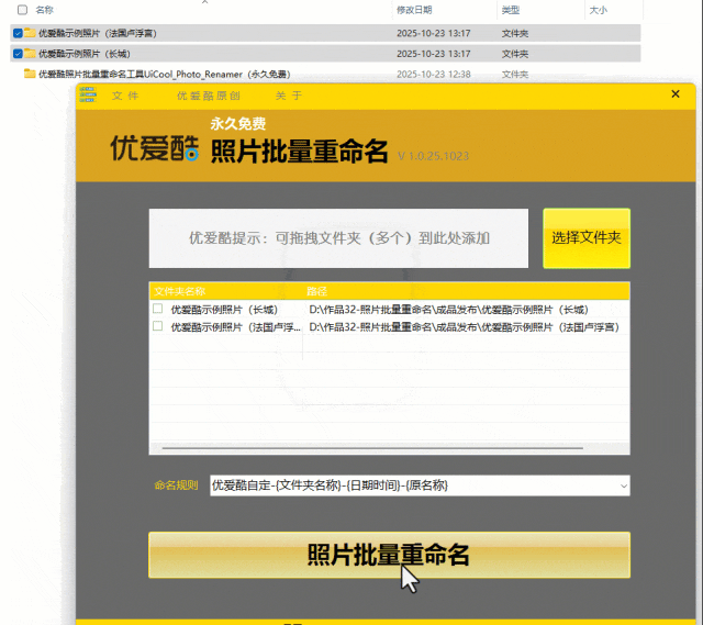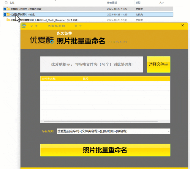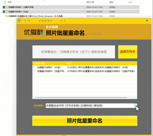 批量高效处理:支持一次性添加多个文件夹,海量照片同步重命名,告别手动逐个修改的繁琐。