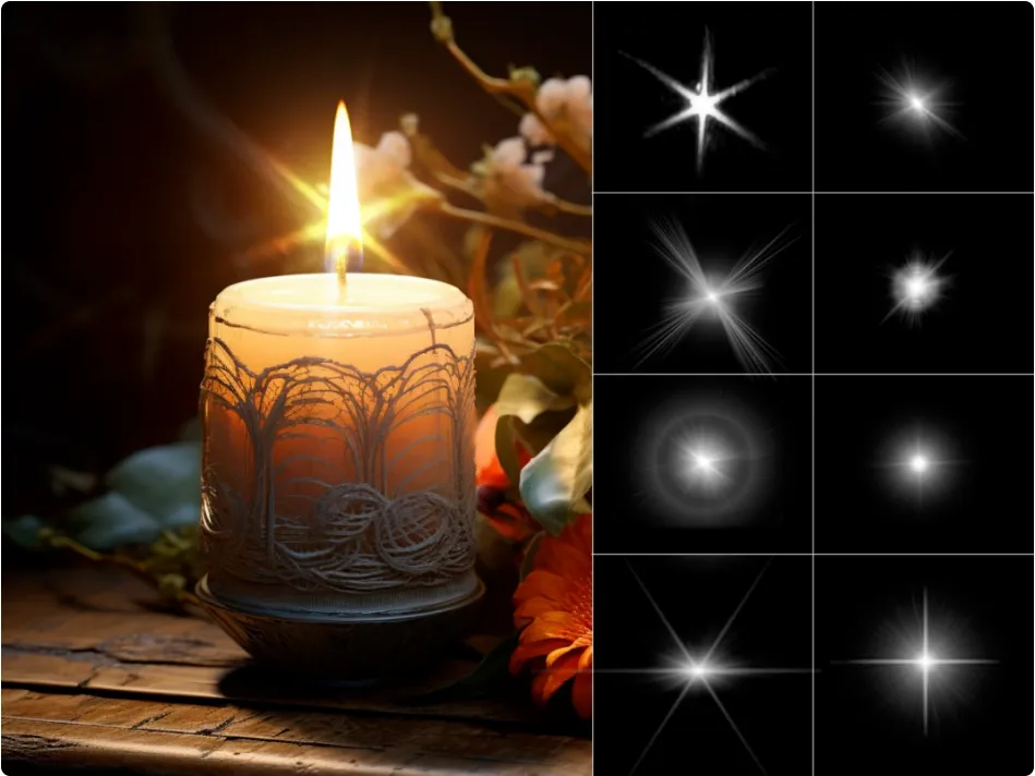 支持18种不同的眩光,可以一键生成酷炫逼真的炫光阵列,常用于照片和特定的夜市效果图后期处理。炫光数量、大小和颜色等均可调节。