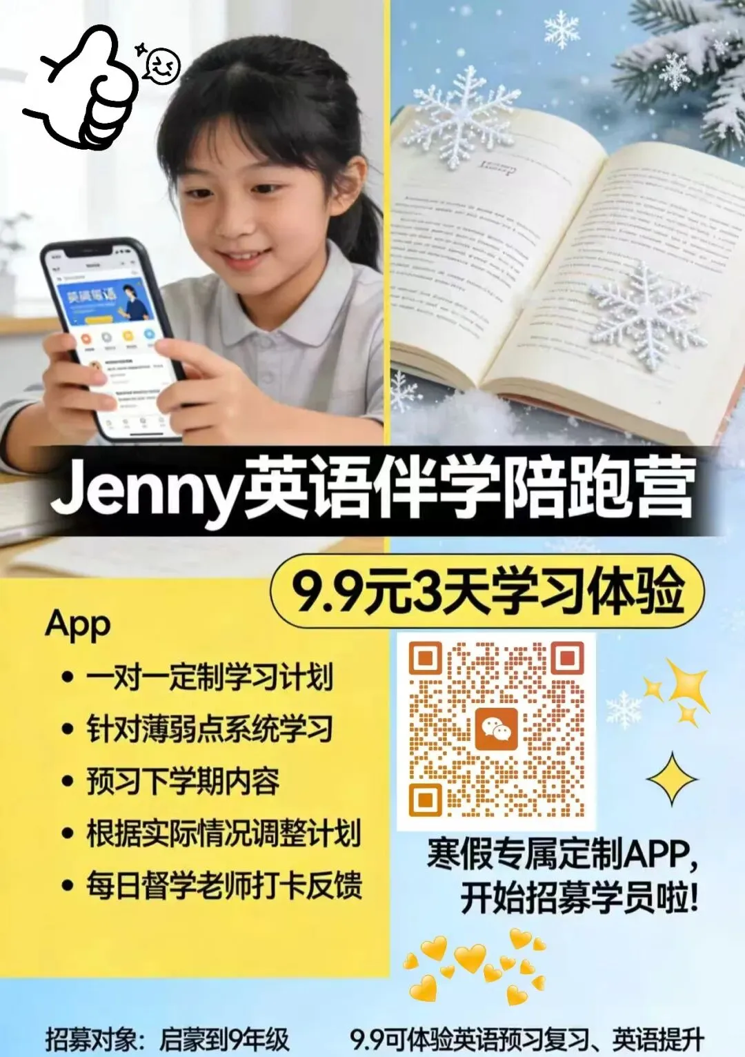 我是深耕小学英语的Jenny老师,专为启蒙到9年级孩子,推出寒假专属英语伴学陪跑营——低成本,体验3天专业伴学,APP定制服务+督学跟进,轻松解放家长,助力孩子英语弯道超车!