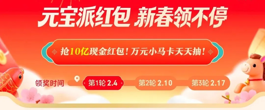 腾讯元宝APP为大家准备了一场超豪华的春节红包盛宴!2026年2月1日至2月17日,元宝APP开启“元宝派红包,新春领不停”活动,10亿现金红包等你来抢,还有万元小马卡、红包膨胀卡等惊喜福利,让你的春节充满惊喜!