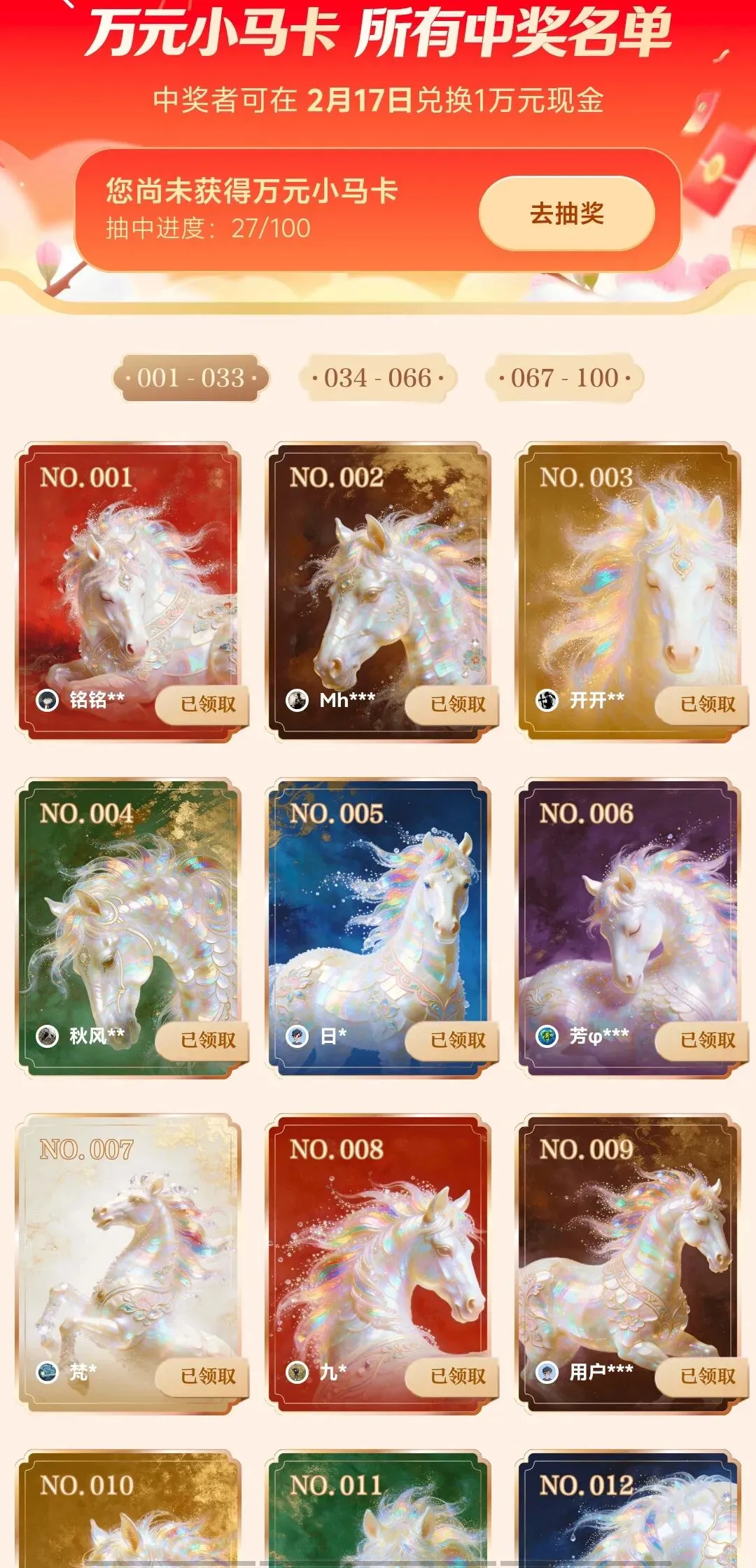 3.万元小马卡限量100张,中奖率较低,建议以积累小额红包为主,理性参与。(已经27人获得小马卡)