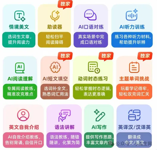 还有12大AI实用功能,覆盖【听、说、读、写、词汇、语法】。比如,把单词放在情境中,阅读中的生词全部扫平,专项攻克阅读理解,选词填补等,全方提升单词运用能力。
