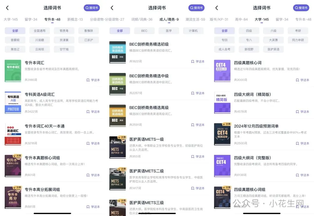 还有针对成人用户的专升本、成人自考、四六级、专四专八、同等学力申硕、考研、BEC剑桥商务、医护英语METS等词书……