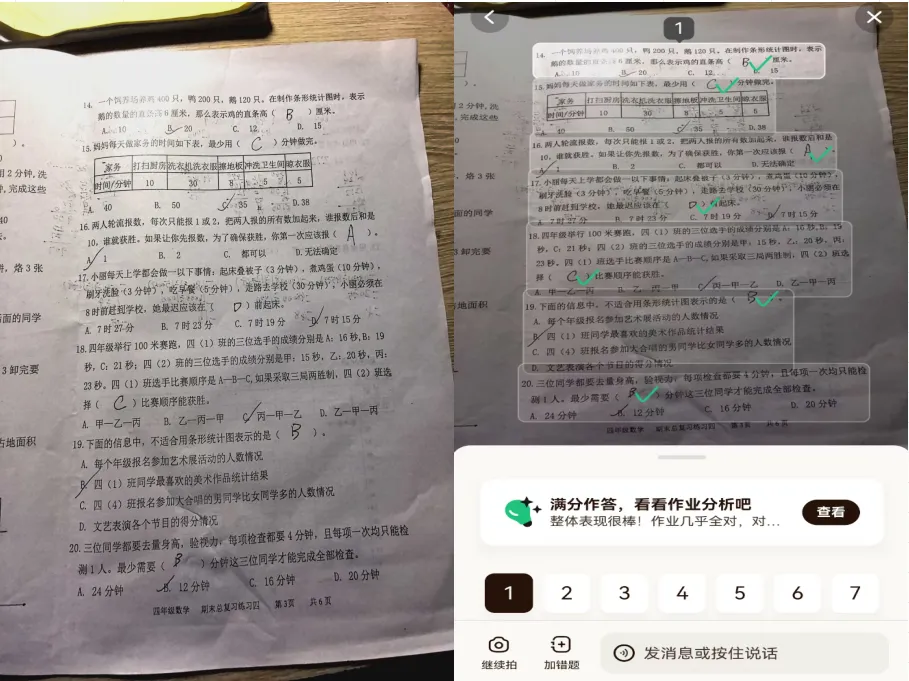 只要对着它拍张照片,那接下来它就会在试卷上标出哪些是做对了,哪些是做错了,这个对于家长来说就真的太有用了。