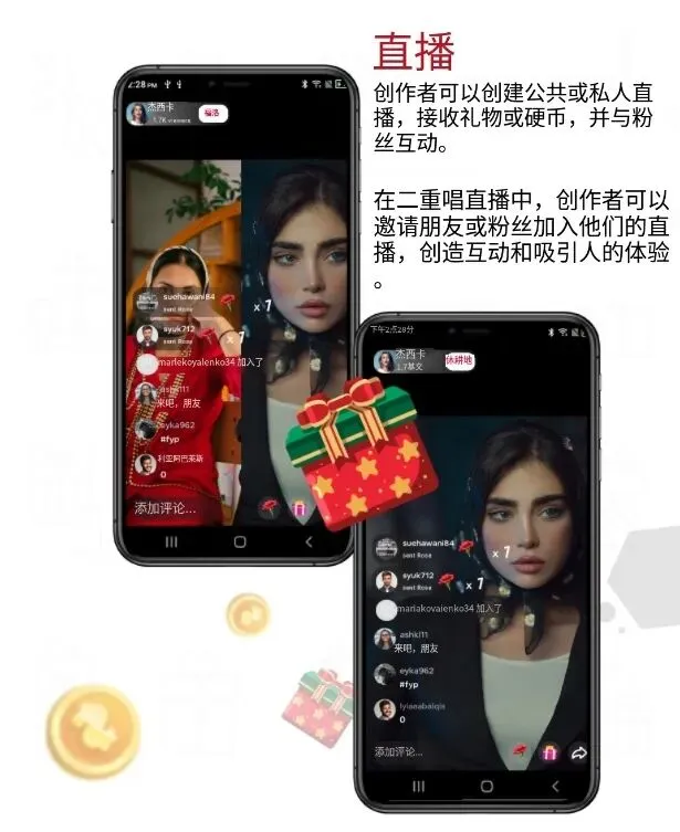 从 “点赞、评论、分享” 的基础互动,到 “私信聊天(支持图片、语音)、直播打赏、双人直播连麦” 的深度社交,我们搭建了关系沉淀的完整路径。