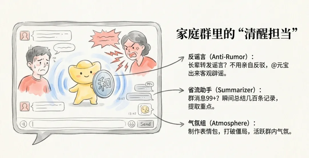 作为晚辈,咱们直接反驳容易吵架。这时候@元宝 出来辟谣,利用AI客观中立的身份,既解决了问题,又保护了家庭和气,岂不妙哉!