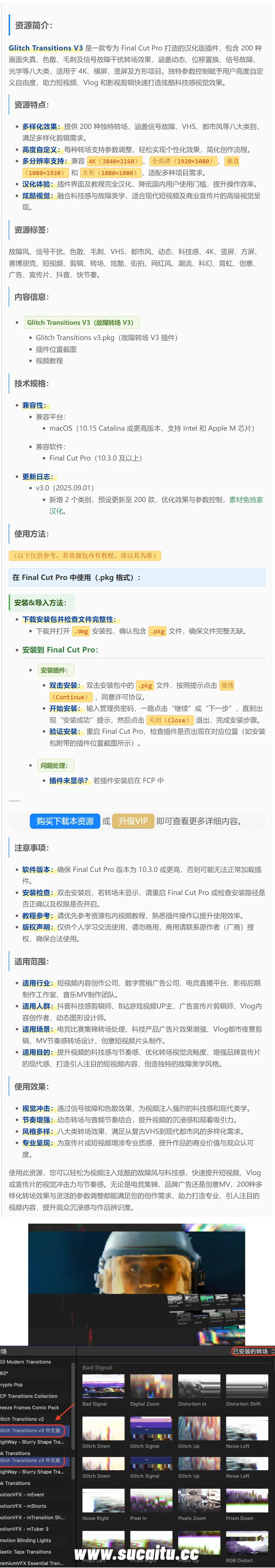 FCPX插件:200种画面失真损坏色散毛刺信号故障干扰转场 Glitch Transitions V3 汉化版