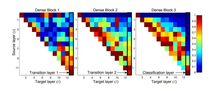 神经网络权重的热力图展示了不同层之间的连接强度,颜色越深表示连接越强