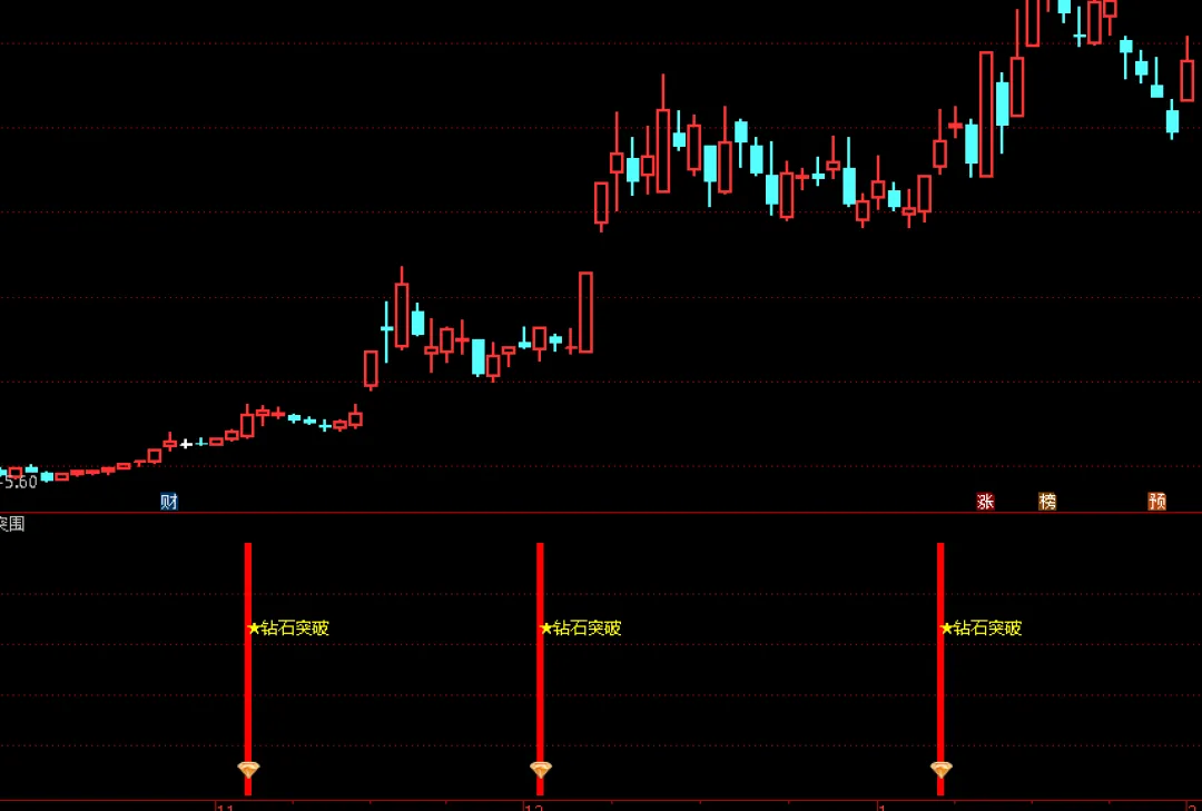 GCZL1:=CLOSE;GCZL2:=10;GCZL3:=(2*GCZL1+HIGH+LOW)/4;GCZL4:=EXPMA(EXPMA(EXPMA(GCZL3,4),4),4);GCZL5:=(GCZL4-REF(GCZL4,1))/REF(GCZL4,1)*100;GCZL6:=MA(GCZL5,3);GCZL7:=MA((VOL-REF(VOL,1))/REF(VOL,1),5);GCZL8:=COST(20);GCZL9:=COST(80);GCZL10:=COST(5);GCZL11:=COST(90);GCZL12:=GCZL9-GCZL8;GCZL13:=GCZL11-GCZL10;GCZL14:=(GCZL13)/GCZL10;GCZL15:=(GCZL12/GCZL8<0.20) AND (GCZL13/GCZL10<0.28);GCZL16:=CLOSE/REF(GCZL1,1)>1.030 AND VOL>REF(VOL,1) AND WINNER(CLOSE)>0.80 AND GCZL2>0;GCZL17:=(GCZL15 OR REF(GCZL15,1)) AND GCZL16 AND CLOSE/REF(GCZL9,2)<1.10;钻石突破:=GCZL17 AND FILTER(GCZL17=1,15);STICKLINE(钻石突破,0,1,1,0),COLORRED;DRAWICON(钻石突破,0.15,26);DRAWTEXT(钻石突破,0.66,'★钻石突破'),COLOR00FFFF;