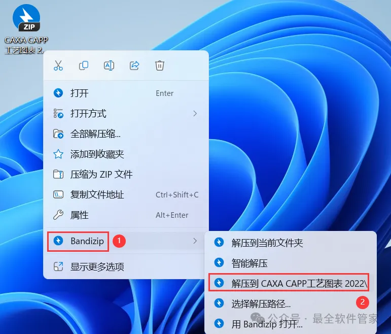 1、下载CAXA CAPP工艺图表 2022软件安装包到电脑上,右键选择【解压到CAXA CAPP工艺图表 2022\】