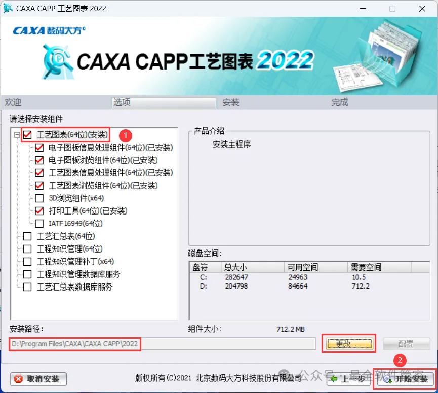 7、勾选需要安装的组件,软件默认安装在C盘,可自定义更改软件安装位置,这里小编选择安装在D盘;点击【开始安装】