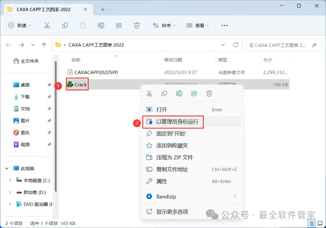 11、回到CAXA CAPP工艺图表 2022文件夹,找到【Crack】应用程序,右键选择【以管理员身份运行】它