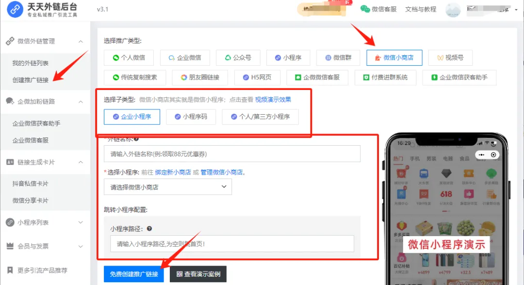接着,利用天天外链简化操作,登录其平台后找到跳转小程序功能,输入小程序的appID、目标页面路径以及任何动态参数,系统会自动生成跳转链接;