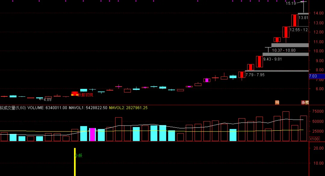 DRAWTEXT(妖股,15,’小妖’),COLOR00CC00;